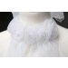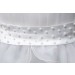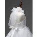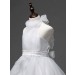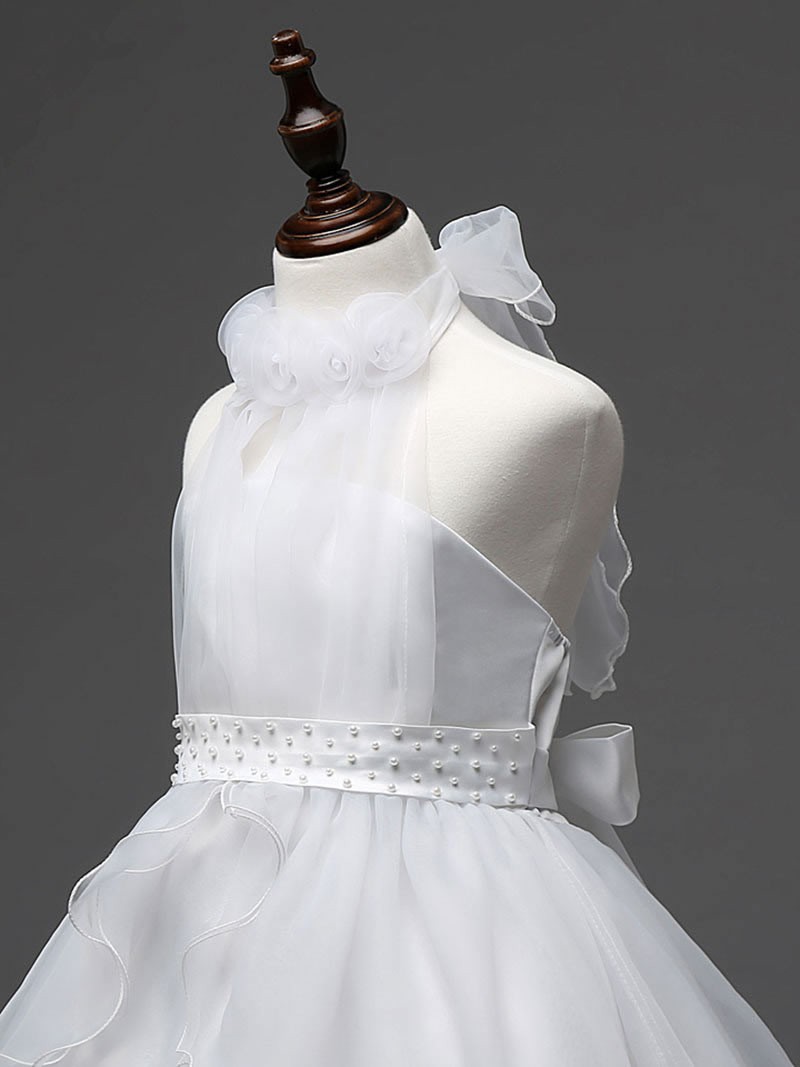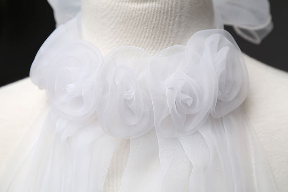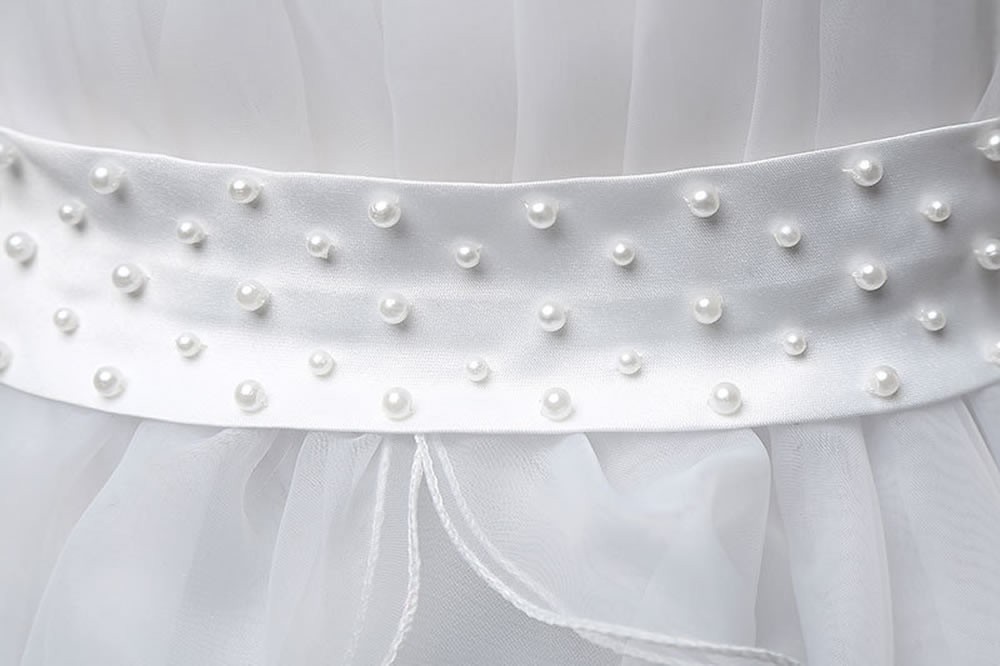 Concealed zip fastening at the back with elasticated bodice and a waist sash that ties in a bow on the back. The front of the dress is finished with faux pearls on the waist, pleated on the chest and organza roses on the neckline. There is s further sash that ties at the back of the neck.