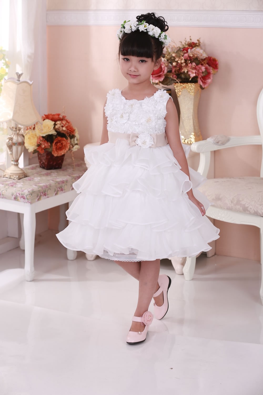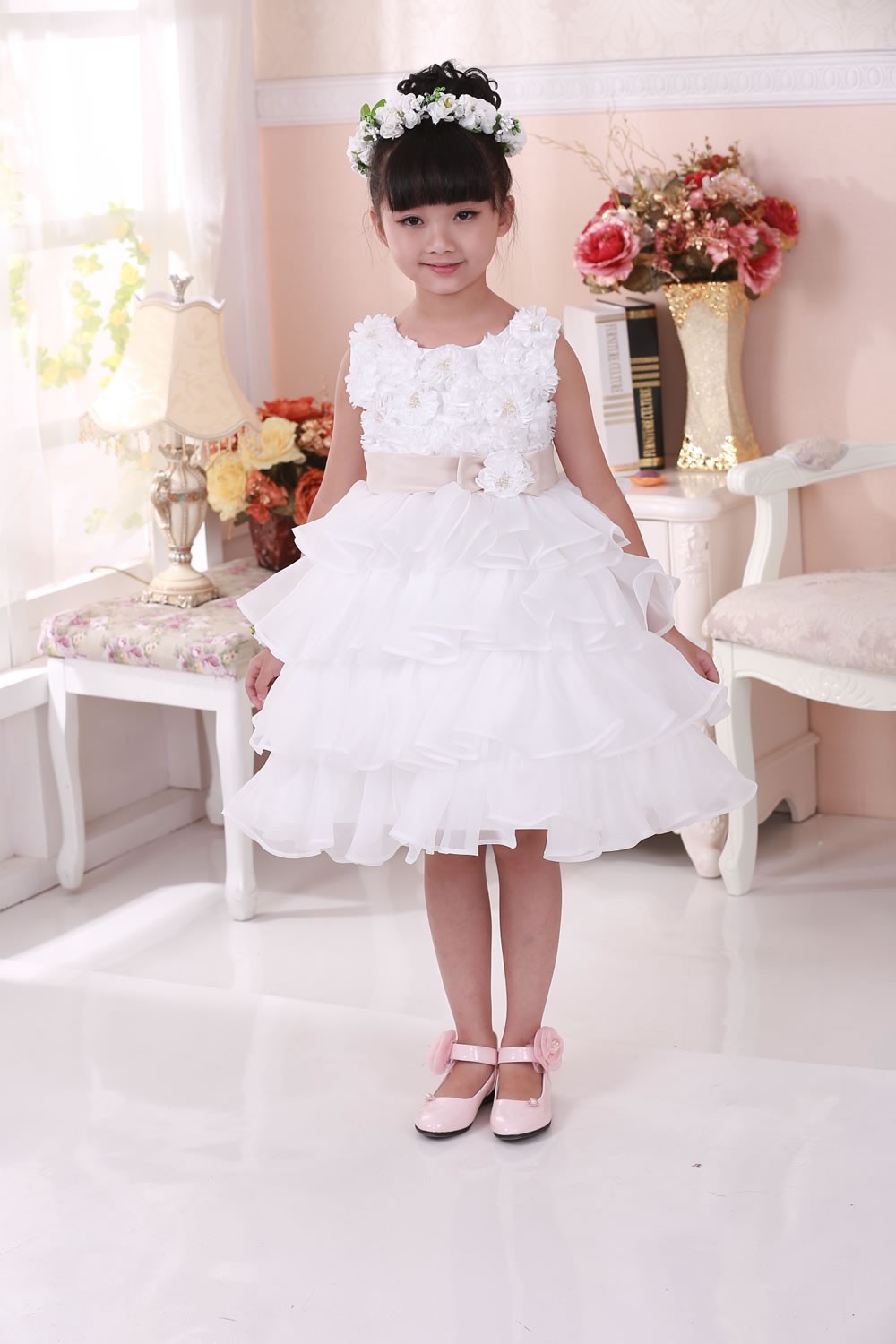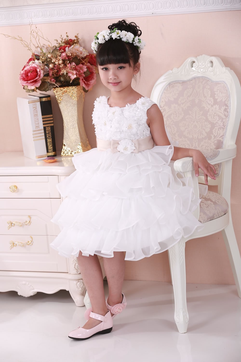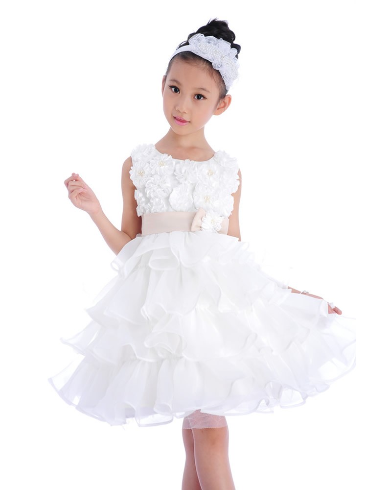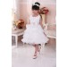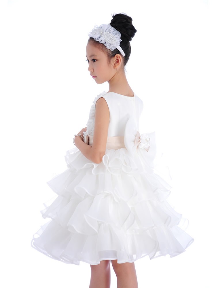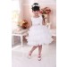 Beautiful occasion dress with ruffle skirt, floral top with faux pearls and large bow on the back. The sash is caramel colour not pink as it appears in the photos.