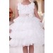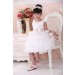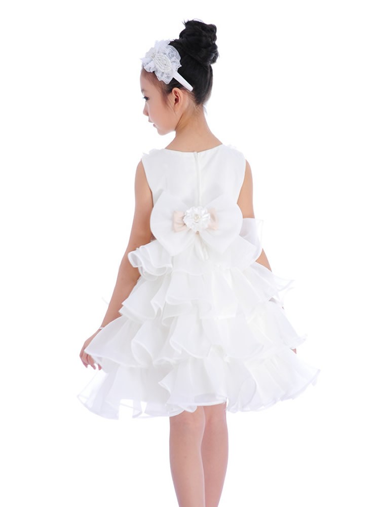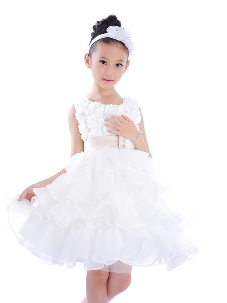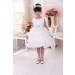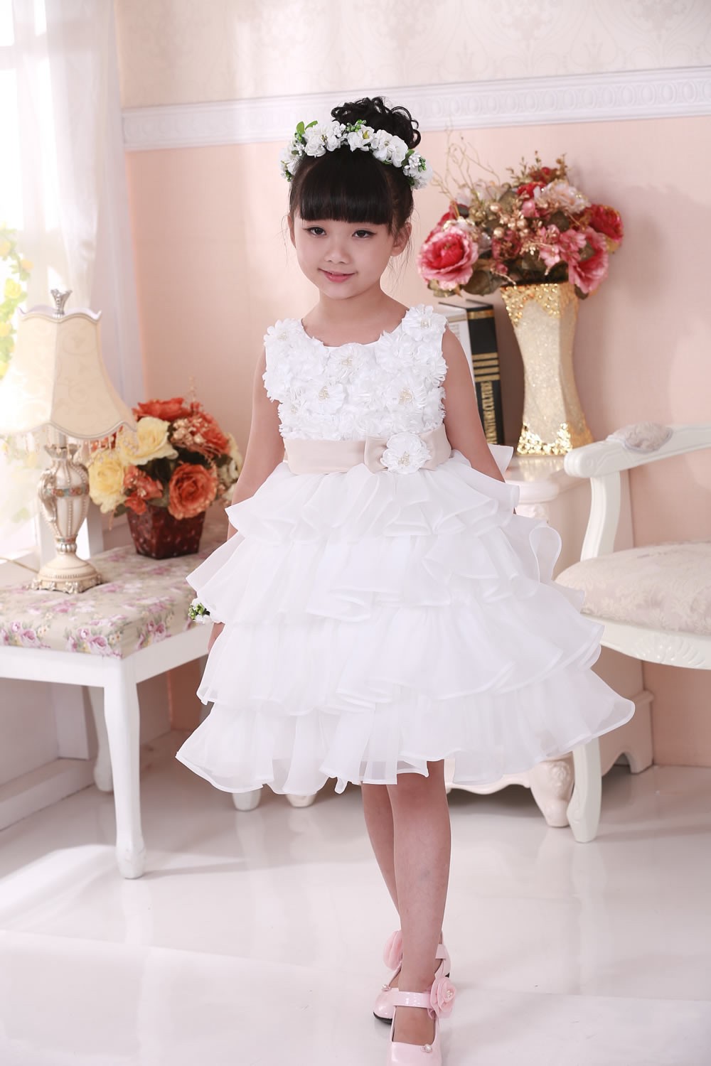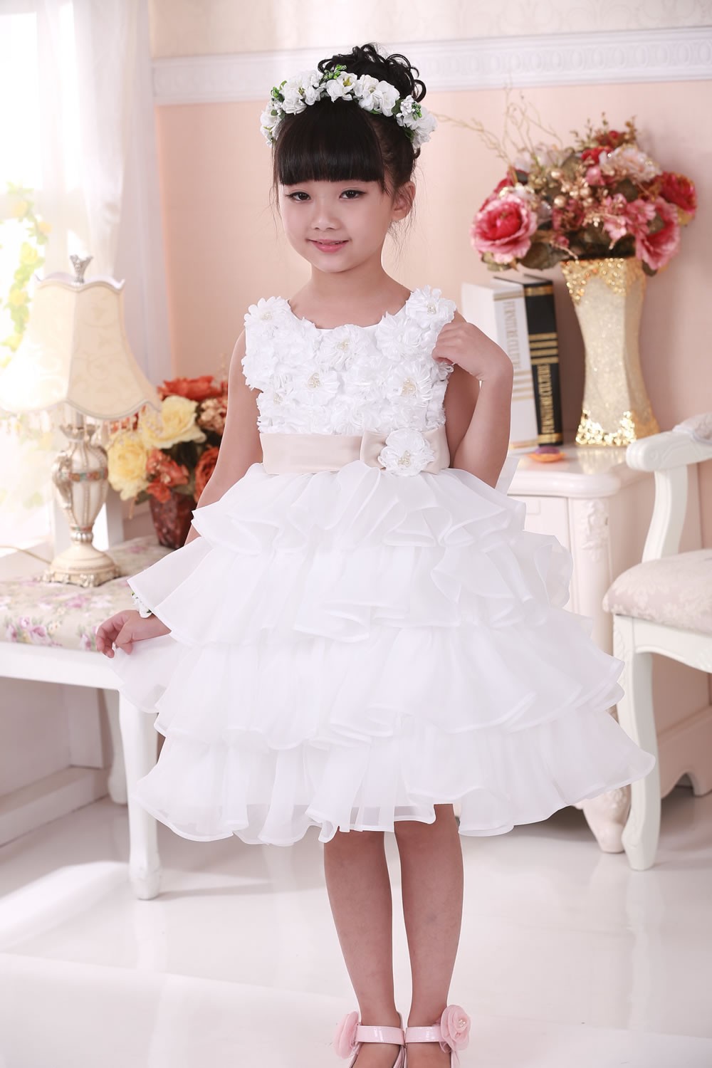Beautiful occasion dress with ruffle skirt, floral top with faux pearls and large bow on the back. The sash is caramel colour not pink as it appears in the photos.