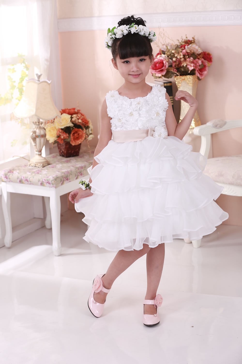 The skirt comprises four ruffle layers, the whole dress is lined with cotton for comfort and there is mesh strip to give body.