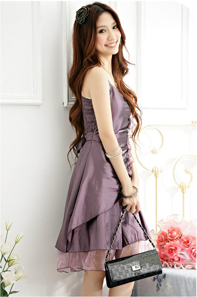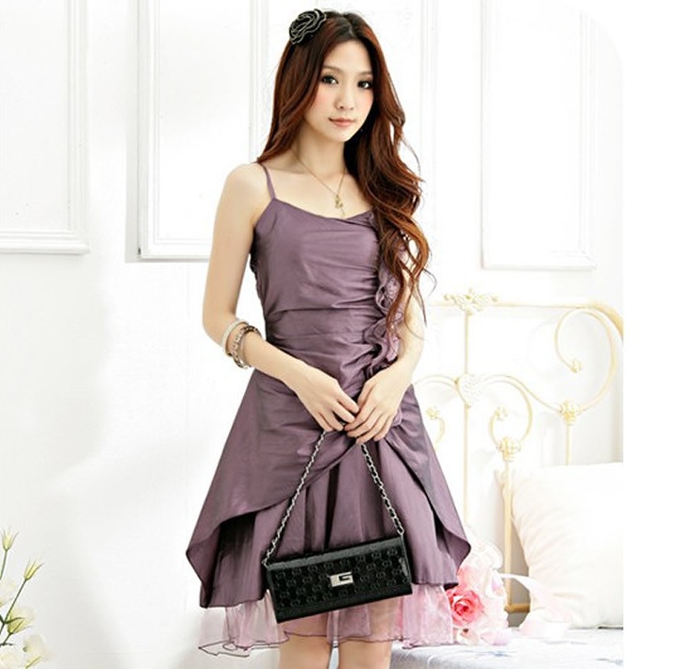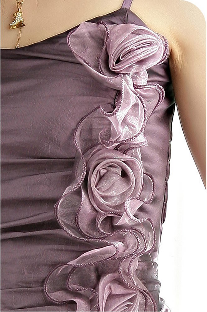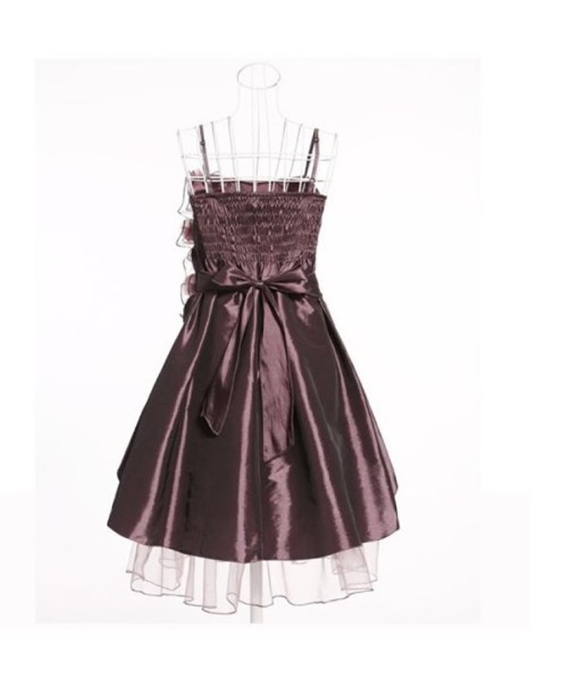 Lovely Satin Knee length evening dress with organza flower detailing and organza hem. Elasicated back and with a sash that ties in a bow at the back. Fully lined. - Reviews