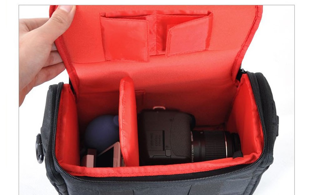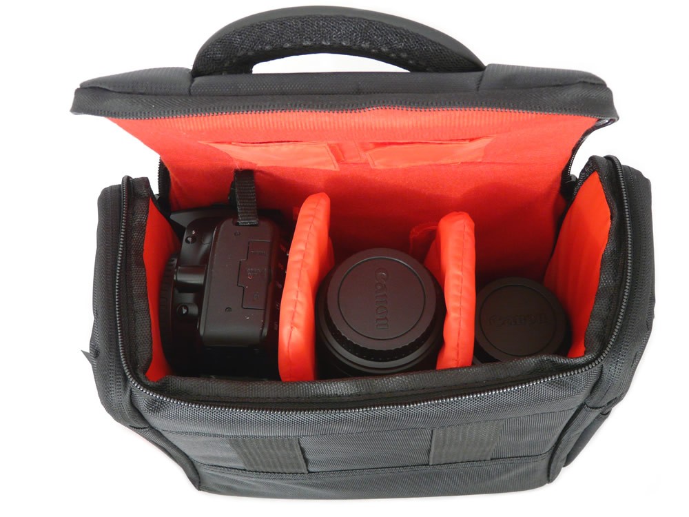 The fully adjustable main interior space can be easily arranged via Velcro fastenings to accommodate a wide variety of DSLR bodies, lenses and accessories. The bag also features two side pockets and two small pouches under the lid.