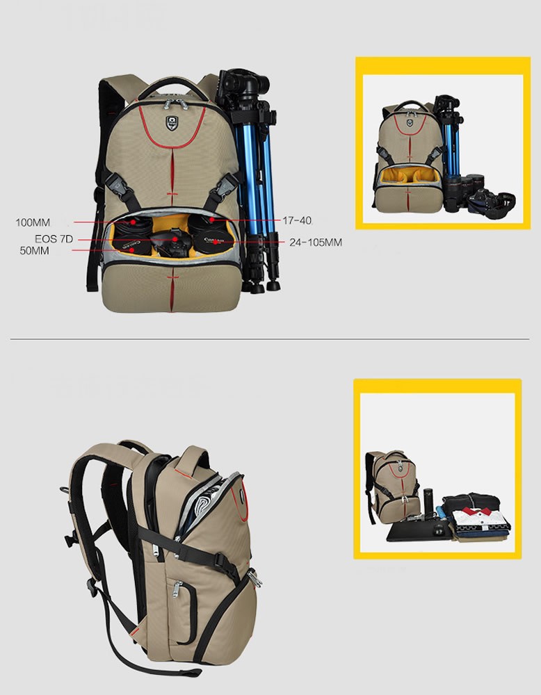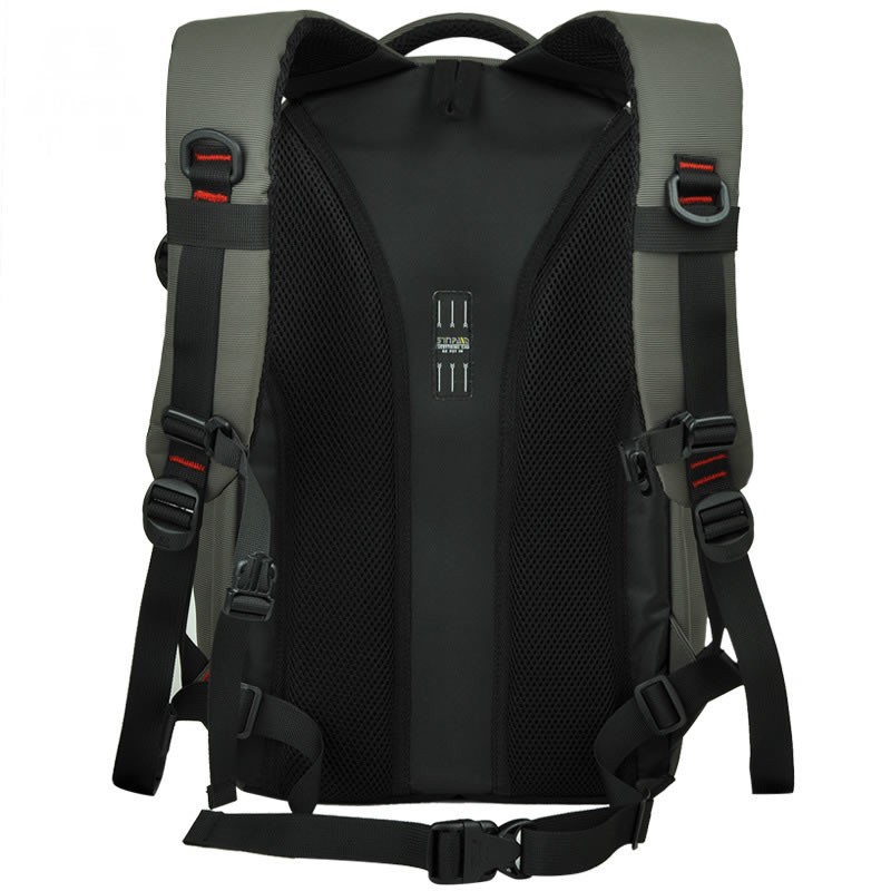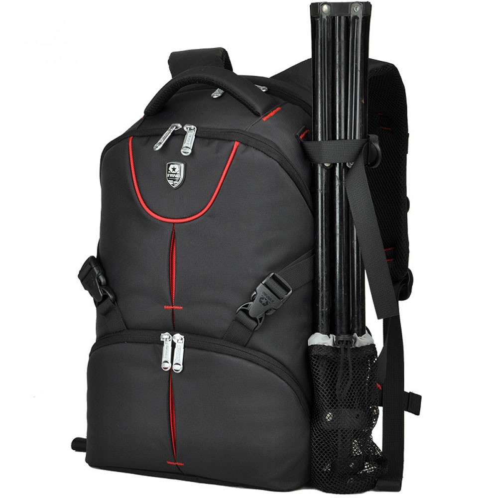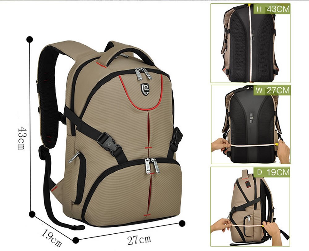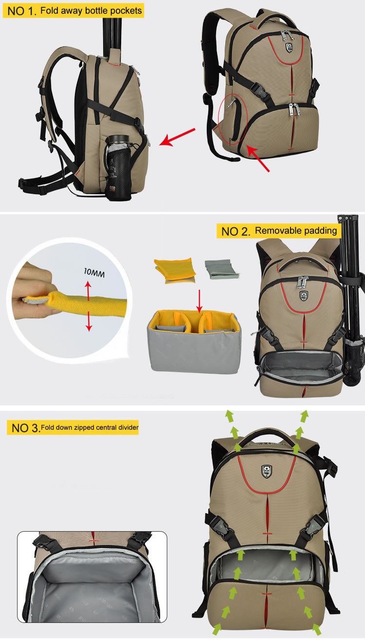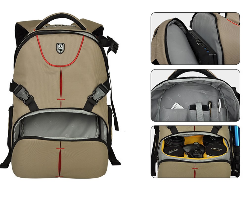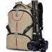 DSLR and laptop backpack designed to hold your camera and accessories while on the move. The backpack features three main sections. The bottom sections contains a customisable padded insert, which can hold and protect a surprising number of items for example a DSLR camera body, 3 lenses and flash. Above that is another decent size compartment and there is a zipped divider between the two so the bag can be configured with one large space. On the back of the pack is a large padded section, perfect for protecting a laptop.