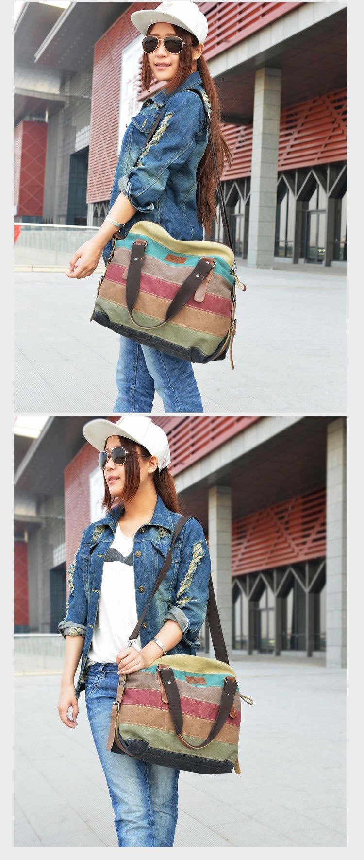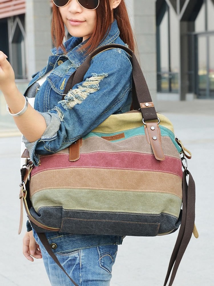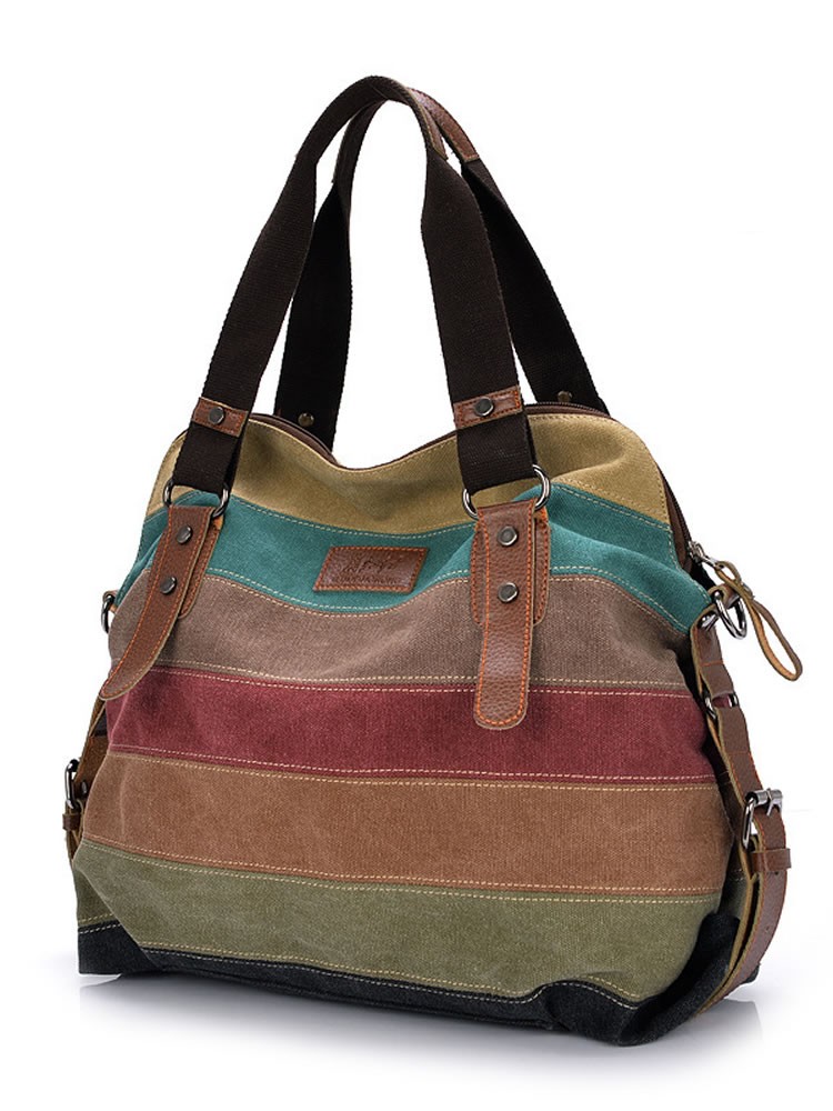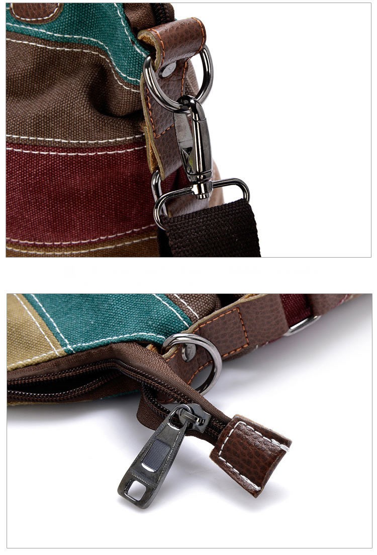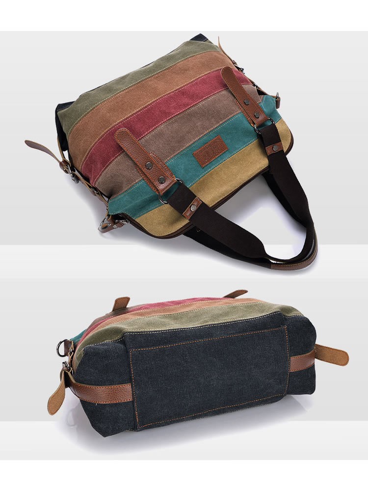 Bang up to date, this modern twist on an old design is a welcome addition to anyone's bag collection. The subtle shades work really well together and are just the right colour depth. The stripes are sewn together from separately dyed canvas pieces and the white stitching works really well. The workmanship is top notch and the zips and fixtures are also of a good quality. Imitation leather details so no animal products in these bags.