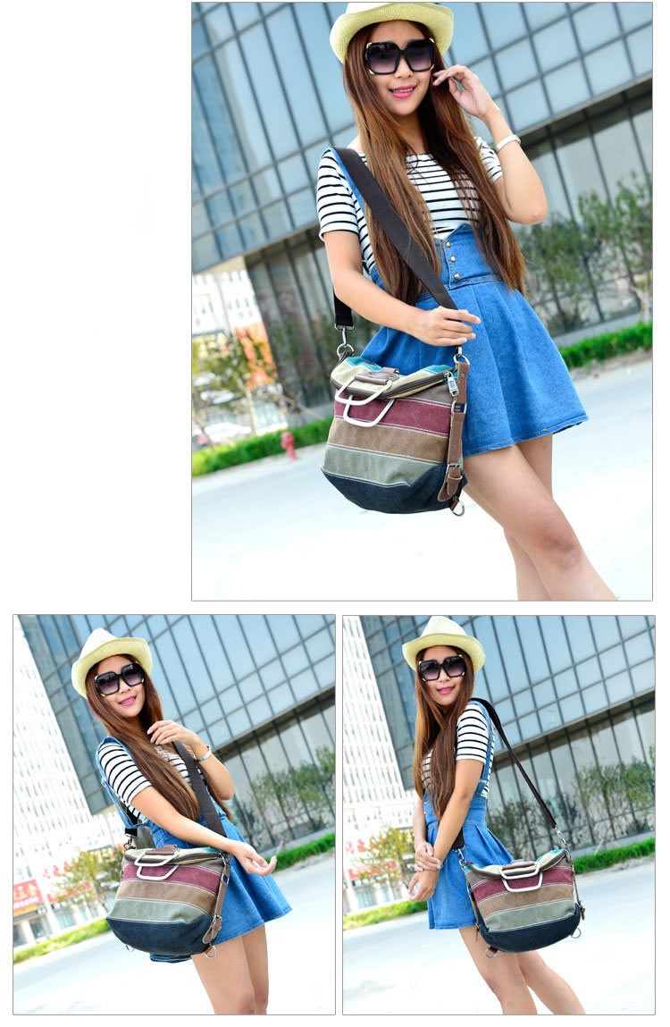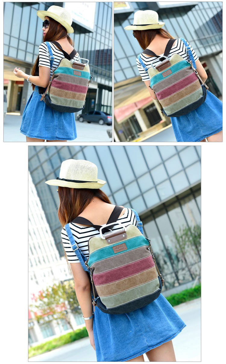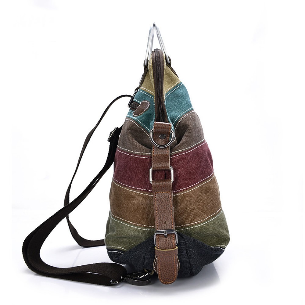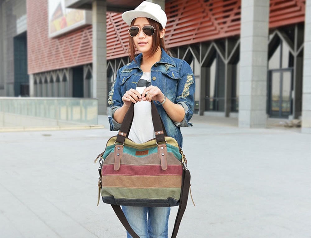 Bang up to date, this modern twist on an old design is a welcome addition to anyone's bag collection. The subtle shades work really well together and are just the right colour depth. The stripes are sewn together from separately dyed canvas pieces and the white stitching works really well. The workmanship is top notch and the zips and fixtures are also of a good quality. Imitation leather details so no animal products in these bags.
